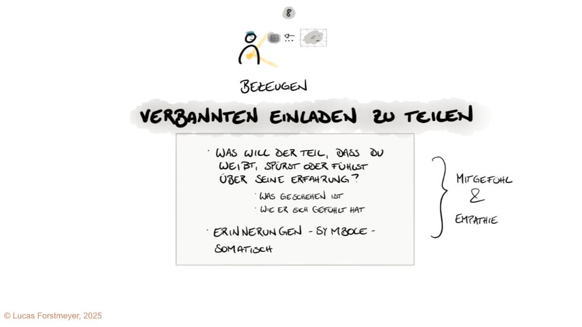 Im Prozess der Arbeit mit den Verbannten sind wir dann hier: Wir haben Verbindung hergestellt, wir haben den Teil wahrgenommen. Und wenn wir ihn wahrgenommen haben und wenn die Teile sich wirklich wahrgenommen fühlen, dann kann der Schritt kommen, auch zu gucken: Wie können wir dem Teil helfen?