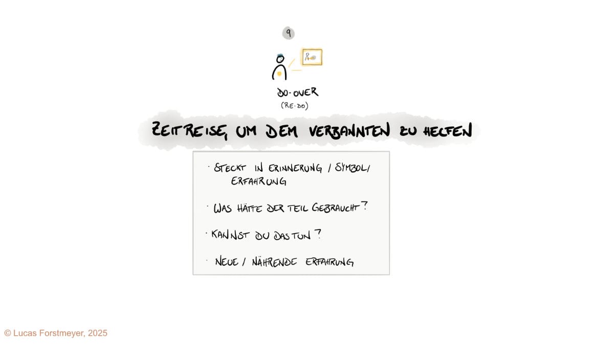 Und in diesem Do-Over geht es darum zu schauen: Was hätte der Teil damals gebraucht? Und können wir wie in einer Zeitreise zu dem Teil in die Erinnerung, die Erfahrung, das Symbol gehen und genau das geben, was der Teil gebraucht hätte?