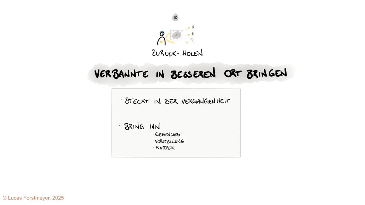 Hier ist noch mal die Erinnerung wichtig auch zu der IFS-Theorie: Verbannte stecken häufig in einer Erinnerung, einer Erfahrung oder in einem Symbol fest. Sie konnten die Erfahrung damals nicht verdauen, und deswegen sind sie da wie drin gefangen.
