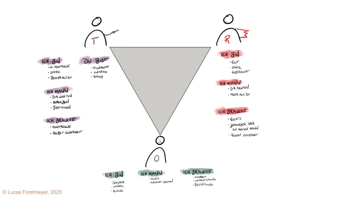 Darauf reagieren zwei andere Rollen, die sich "von oben" aufstellen, also eine "one up"-Position einnehmen. Sie stellen sich höher und sagen: "Ich bin besser als du" – entweder, weil du etwas falsch machst, oder weil ich dir gerade helfe. Die stabilsten und häufigsten Dynamiken im Drama-Dreieck finden genau zwischen dem Opfer und einer dieser beiden "one up"-Rollen statt.