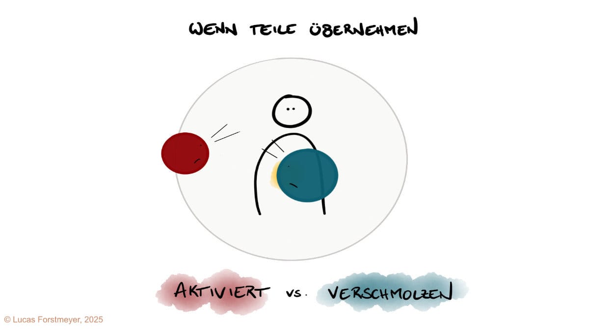 Zusammengefasst: Teile können aktiviert sein, Teile können mit uns verschmelzen. Teile sind ein bisschen wie kleine Menschen in uns. Und wenn diese Teile übernehmen oder aktiviert sind, werden wir mehr wie diese Teile – wir fangen an, deren Persönlichkeit und Perspektiven zu übernehmen.
