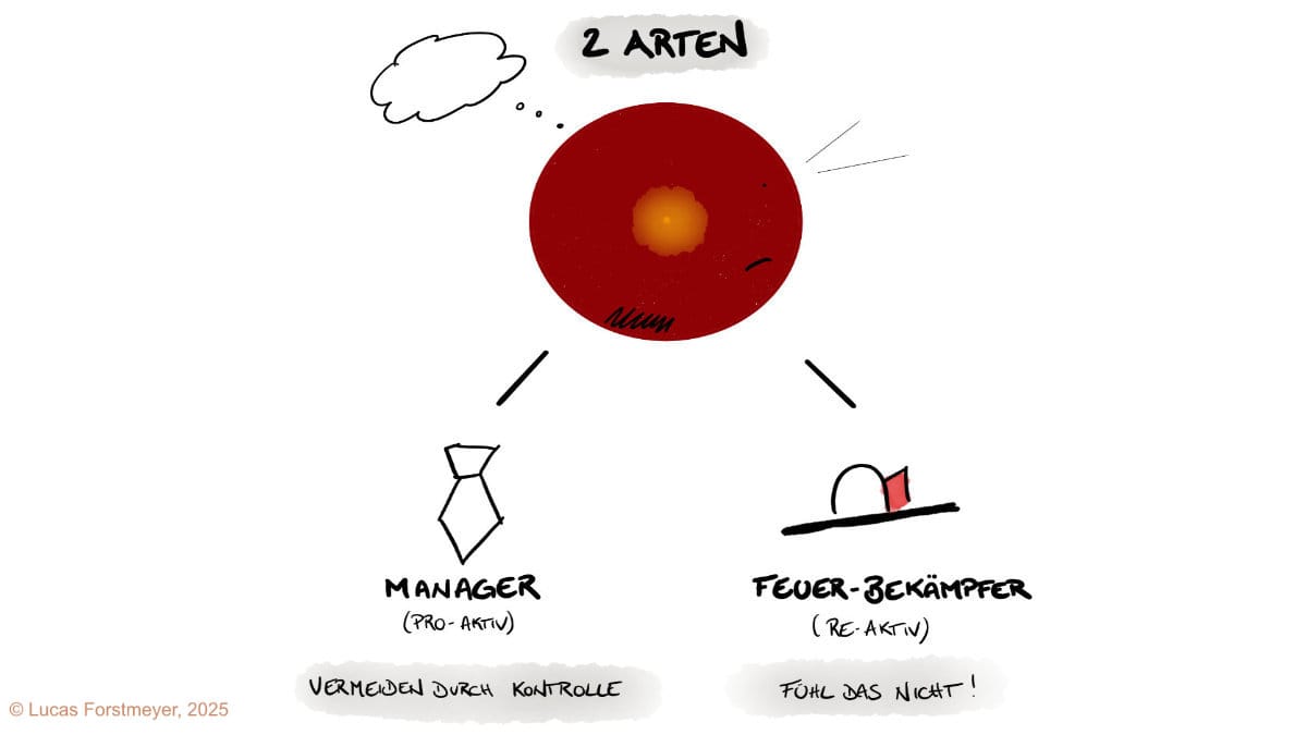 Manager arbeiten proaktiv und versuchen, unser Leben durch Kontrolle zu organisieren. Feuerbekämpfer arbeiten reaktiv und versuchen, uns durch Vermeidung von bereits aufkommenden Emotionen wegzubringen.