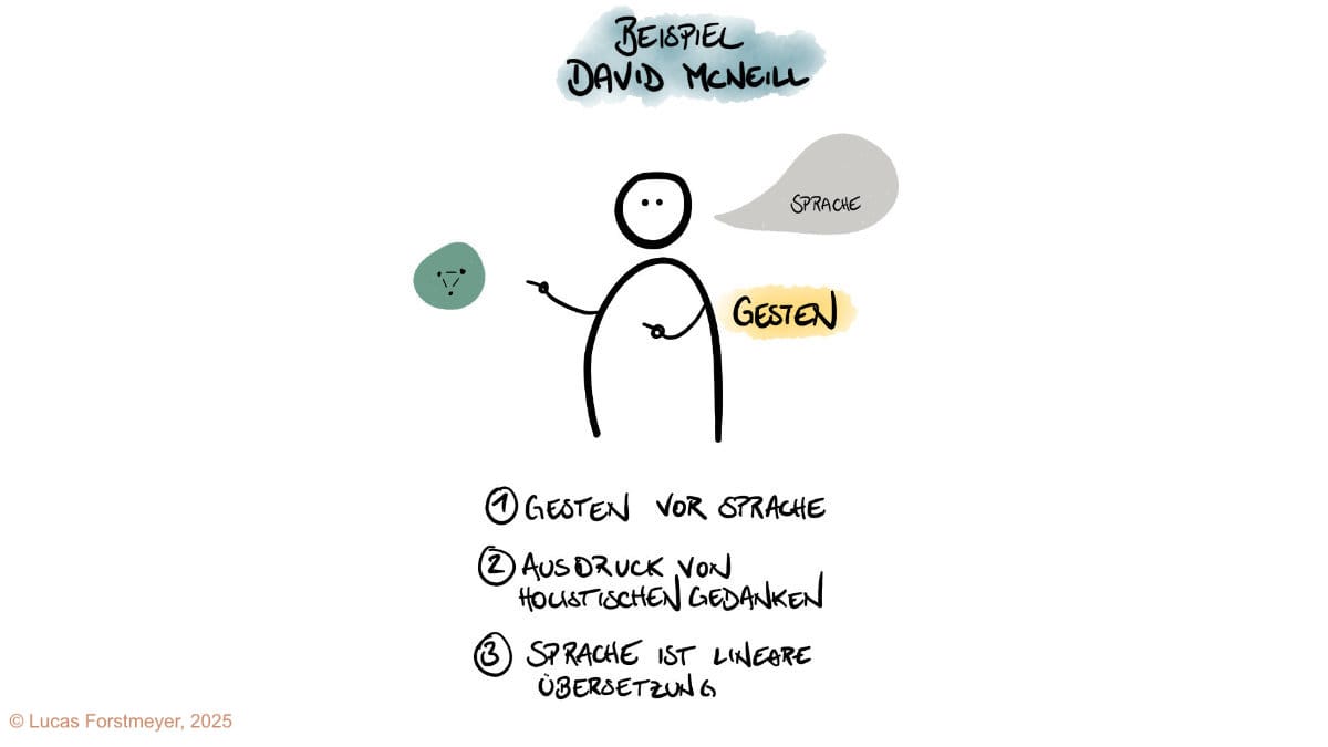 Diese auf den ersten Blick abstrakte Theorie wird durch die faszinierende Forschung von David McNeill zu Gesten und Sprache greifbar. McNeill analysierte über Jahre Videoaufnahmen von sprechenden Menschen und kam zu einer erstaunlichen Erkenntnis: