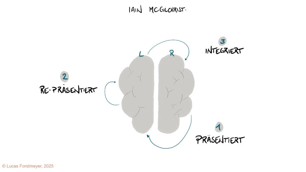 Nach dem Modell von Iain McGilchrist ist das Zusammenspiel unserer Hemisphären ein klar definierter Prozess. Es ist nicht so, dass die linke Hemisphäre eigenständig neue Ideen entwickelt. Stattdessen läuft es so ab: