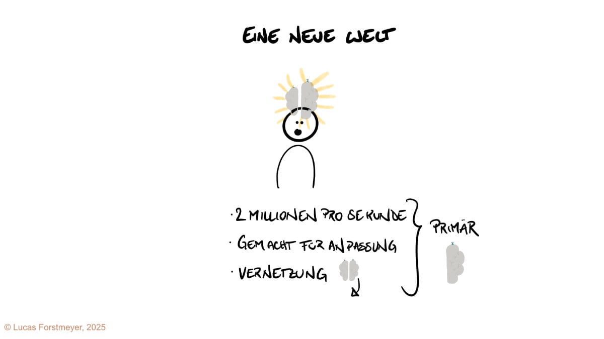 Im Gegensatz zu vielen anderen Lebewesen kommen wir Menschen quasi nicht fertig entwickelt zur Welt. Unser Gehirn ist bei der Geburt noch relativ klein, damit wir überhaupt durch den Geburtskanal passen. Die eigentliche Explosion des Wachstums findet erst danach statt, in einer neuen Welt, an die wir uns anpassen müssen.