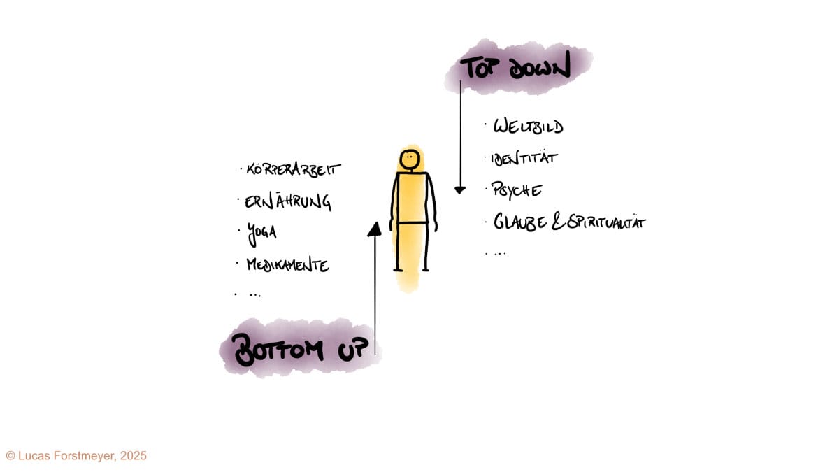 - Top-Down (vom Geist ausgehend): Wir erkennen an, dass auch unsere innere Welt die körperlichen Prozesse tiefgreifend beeinflusst.